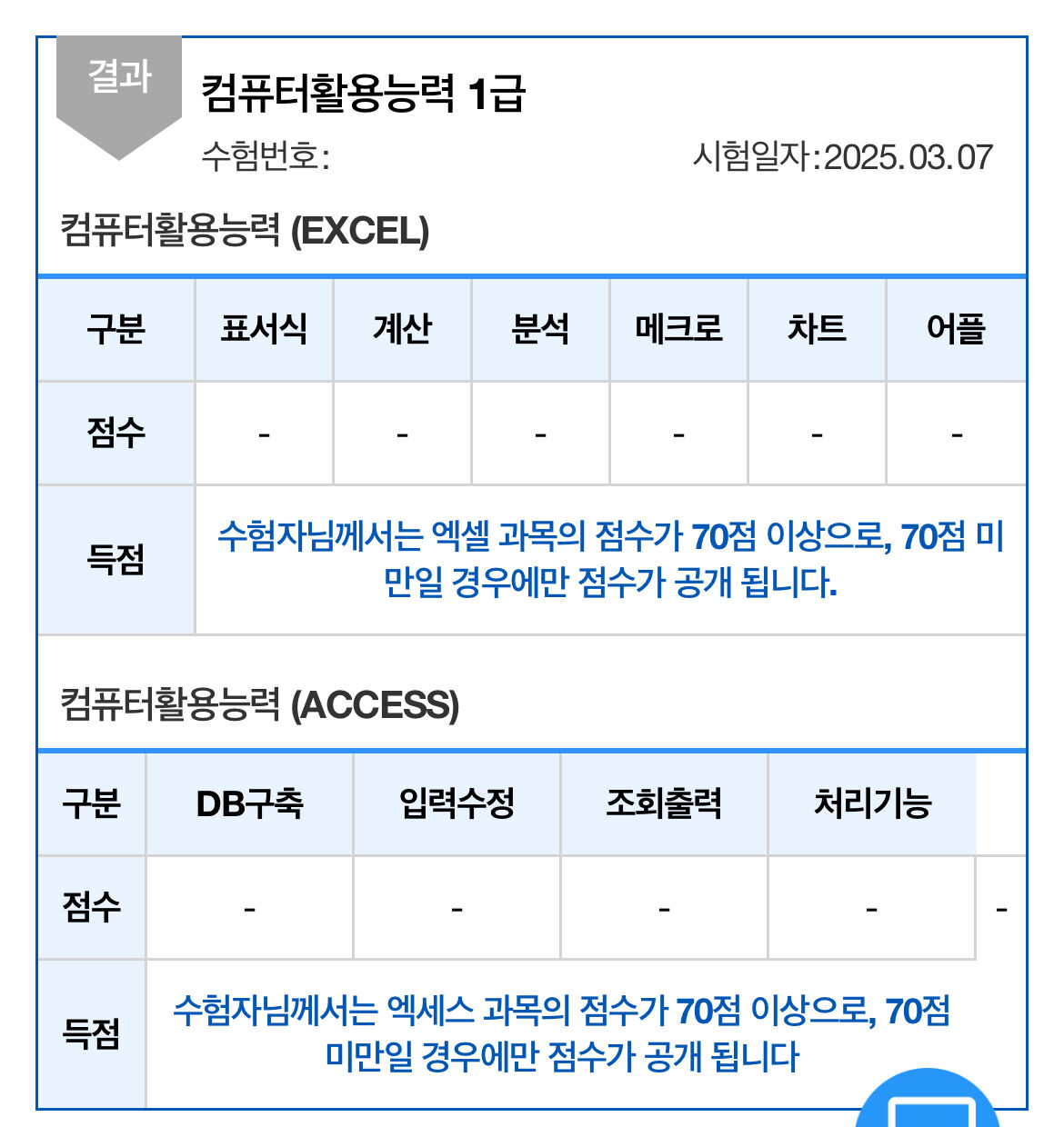 과정은 정말 정말 쉽지 않았지만 피 땀 눈물의 노력 끝에 컴활 1급을 따게 돼서 너무 기쁩니다(균쌤 감사합니다ㅜㅜ)