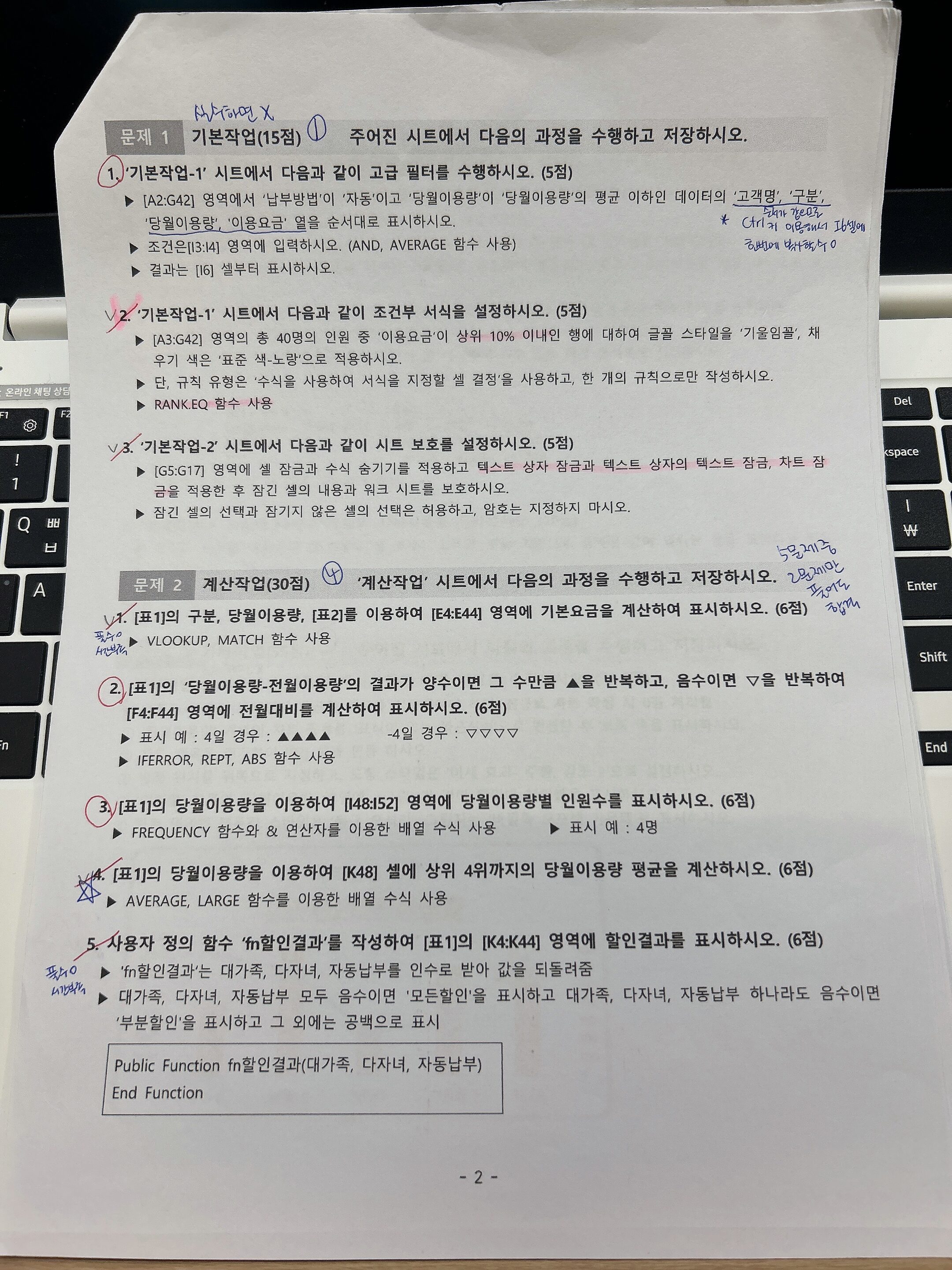 엑셀에서 시간이 많이 소요되는 프로시저 2번 문제는 버리고 시험에서 아예 풀지 않았습니다