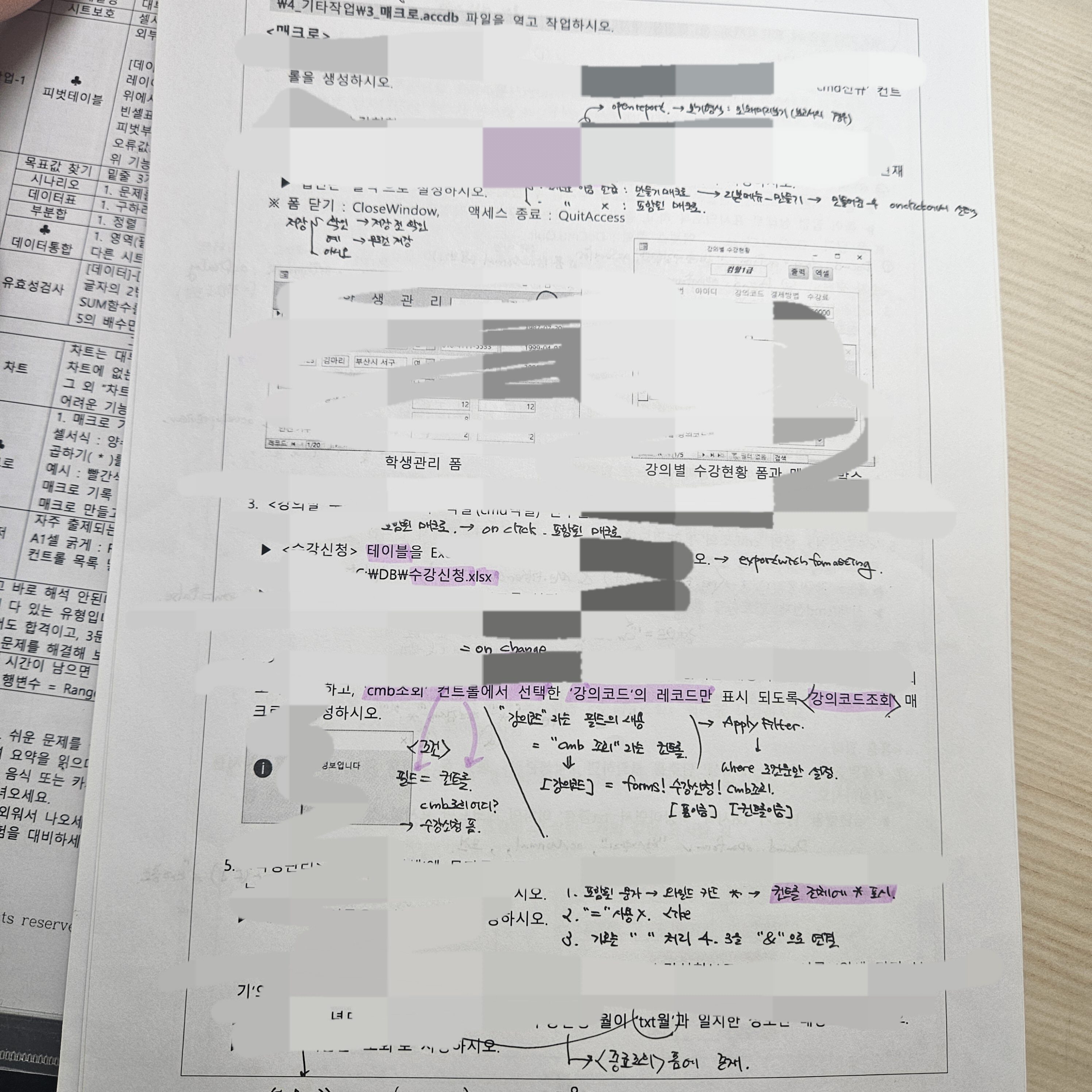 엑세스의 경우는 강의자료가 A4 용지 몇장으로 압축되어 나오게 되는데, 저는 강의를 들으며 중요한 내용을 필기하고, 가지고 다니며 자투리 시간에 실습 과정 중 어려웠던 부분을 위주로 반복 복습했습니다.