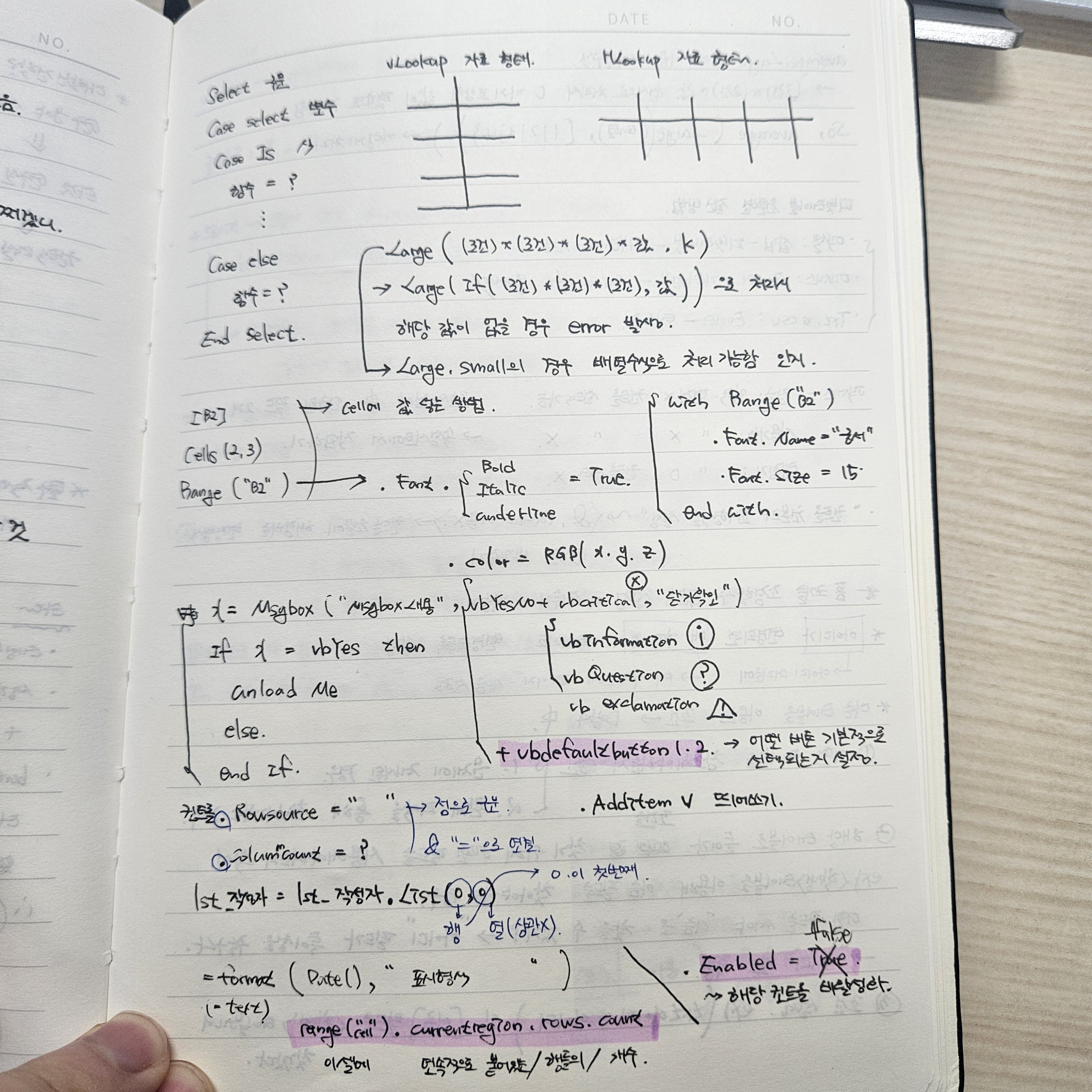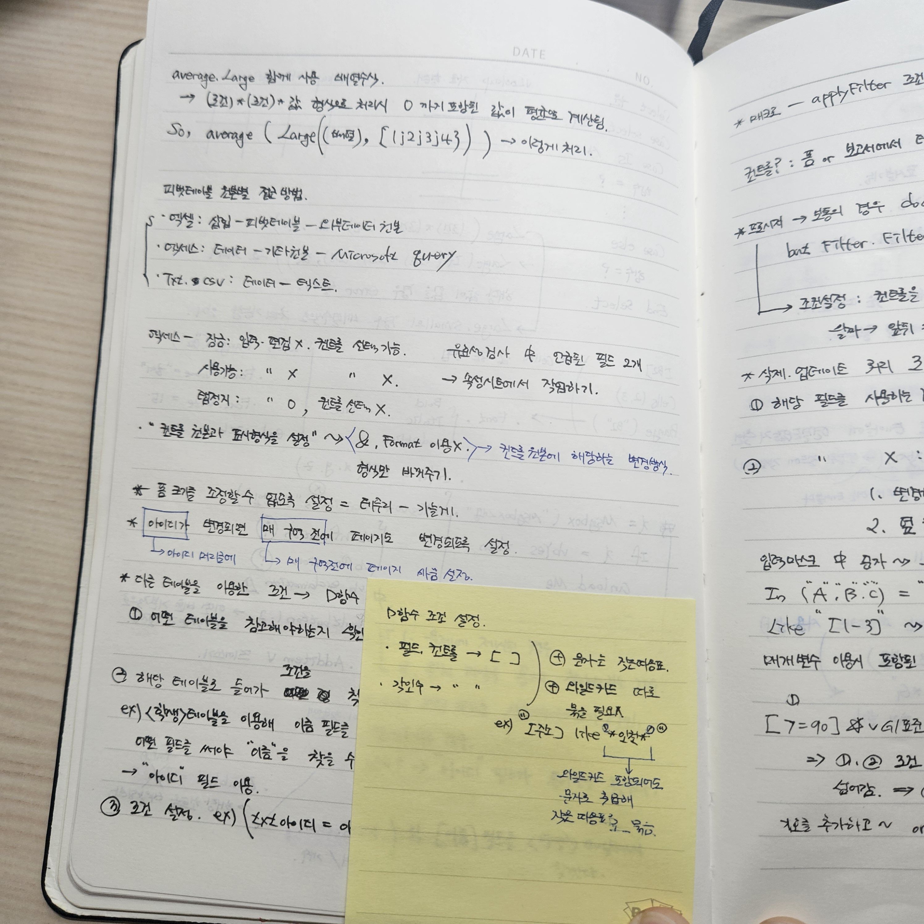 쭉 커리를 타고 오면, 강의 마무리 부분에서 총 5회의 기출 문제를 풀게 될텐데요. 이 기출 역시 "균쌤이 하라는대로" 40분의 시간 제한을 두고 실전처럼 풀어보았습니다. 처음 1회를 풀때는 정말 많이 좌절했습니다. 복습도 정말 열심히 했고, 균쌤이 하라는대로 했는데 문제는 풀릴듯 안풀리고, 균쌤이 알려주지 않은 유형에 당황하고, 배운 내용을 어떻게 응용해야되는지도 모르겠고...이제껏 균쌤과 걸어온 길이 잘못된 게 아닌가 하는 생각까지 들었습니다. 균쌤에 대한 의심이 살짝 생기긴 했지만,(결국은 제 잘못이였지만요... 죄송합니다.) 모의고사를 분석한 후 내린 결론은, "어떤 식으로 풀어야하는지는 알지만, 디테일이 부족하다." 였습니다. 완벽히 숙지했다고 생각한 개념이 사실 완벽하지 않았던 거지요. 프로시저의 조건을 작성할 때 [필드명] = [폼이름]!forms![컨트롤명] 형태로 작성하고 있었고, 이럴 때 와일드카드는 어떻게 처리해야 하는지, 피벗테이블에서 시트는 어디를 눌러 추출해야하는지 제대로 파악하지 못했습니다. 따라서 노트 한 권을 만들어 기출문제를 보면서 부족했던 부분들을 하나씩 다시 공부해가며 이 역시 자주 반복해 학습했습니다. 이때 제가 정리했던 내용들은 D함수에서 대괄호 치는 인수, 매크로 조건 작성 방법, 프로시저 중 숫자, 문자, 날짜가 포함되어 있을 때 어떤 식으로 조건을 작성해야 하며, 작은 따옴표를 어디에 붙이고, & 기호를 어디에 연결해야하는지, 배열 수식에서 LARGE, IF를 함께 사용할 때의 주의할 점 등이 있었네요. 기출 문제 5회분은 문제의 최신 동향을 파악하기 위한 과정이기도 하지만, 자신의 부족한 부분을 보충함으로써 한 층 더 단단하게 시험에 대비할 수 있는 중요한 단계 입니다. 그 과정이 마냥 순탄하지는 않겠지만, 하나씩 정복해나가다 보면, 모의고사 점수가 조금씩 오를 것이라고 생각합니다.(그래도 안산복원문제는 정말 어려웠습니다.)